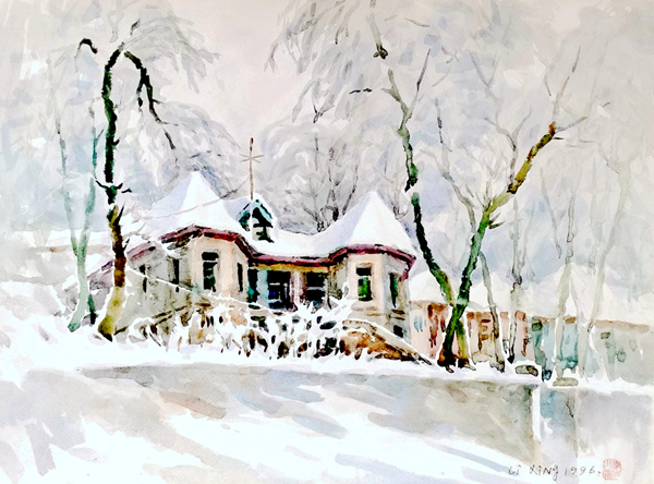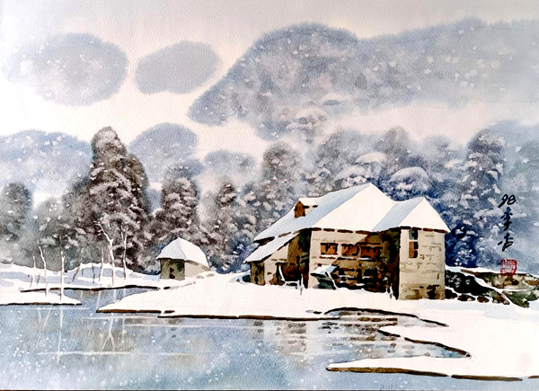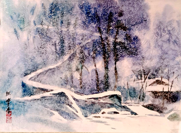 廬山不僅山靈水秀、俊美絕倫,而且還出人才。中國美協(xié)會員、廬山美協(xié)主席、畫院院長李杏,就是一位地道的廬山人,一個終身奮斗于水彩畫事業(yè)的不可多得的畫家。李杏不少作品抒寫匡廬冬日冰天雪地的綺麗風光,有的是在零下十余度的室外完成的,如《冰凍時節(jié)》、《廬山雪》等。那種清寒入骨、滴水成冰,畫筆在調色盒里涮涮作響,水與色在畫面上凍成冰花的滋味,非身臨其境者,是不可能想象其甘苦程度的。