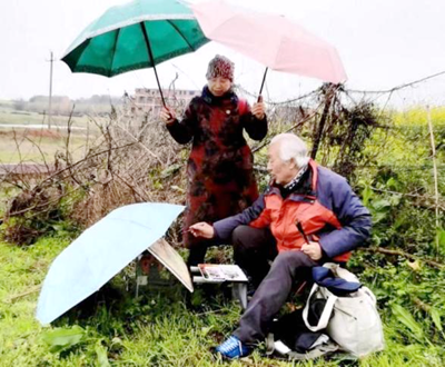 看李杏用大開紙、大毛筆現(xiàn)場直接水彩寫生,水色淋漓、畫得很大氣。作為一名老藝術家,還擔任過地方美協(xié)和畫院領導,能長期堅持外出寫生很難得。