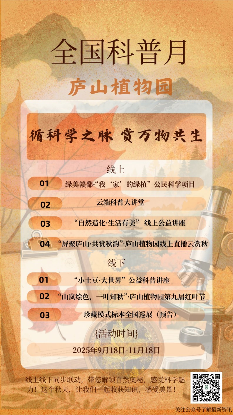 秋意漸濃,層林盡染,在全國首個科普活動月隆重開啟之際,一場融合知識與美景的科普盛宴即將開啟!2025年9月18日至11月18日,廬山植物園特別推出為期兩個月的“循科學(xué)之脈,賞萬物共生”主題活動,線上線下同步聯(lián)動,帶您解鎖自然奧秘,感受科學(xué)魅力!