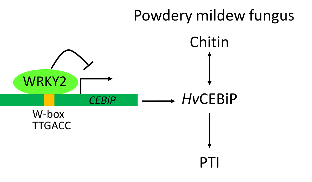 研究分析了WRKY2結(jié)合順式元件W-box(TTGAC-C/T)的分子特征。通過創(chuàng)制WRKY2轉(zhuǎn)基因株系并開展ChIP-seq分析,獲得系列WRKY2的潛在靶標(biāo)基因。其中一個是大麥HvCEBiP,其與水稻幾丁質(zhì)受體編碼基因OsCEBiP同源。進(jìn)一步體內(nèi)和體外實驗證實WRKY2能直接結(jié)合CEBiP啟動子區(qū)的W-box序列,瞬時單細(xì)胞基因過表達(dá)和基因沉默技術(shù)證明CEBiP正調(diào)大麥對白粉病抗性(圖1)。提出了WRKY2可能的一個工作模型,即大麥CEBiP介導(dǎo)真菌幾丁質(zhì)激發(fā)的抗病通路,WRKY2通過結(jié)合到CEBiP的啟動子區(qū)調(diào)控CEBiP的表達(dá),在病原菌侵染早期阻遏了植物的抗病反應(yīng)(圖2)。結(jié)合之前報道大麥抗病蛋白MLA激活后解除WRKY2阻遏作用,該研究進(jìn)一步闡明了大麥PTI和ETI抗性途徑的關(guān)聯(lián)機(jī)制。