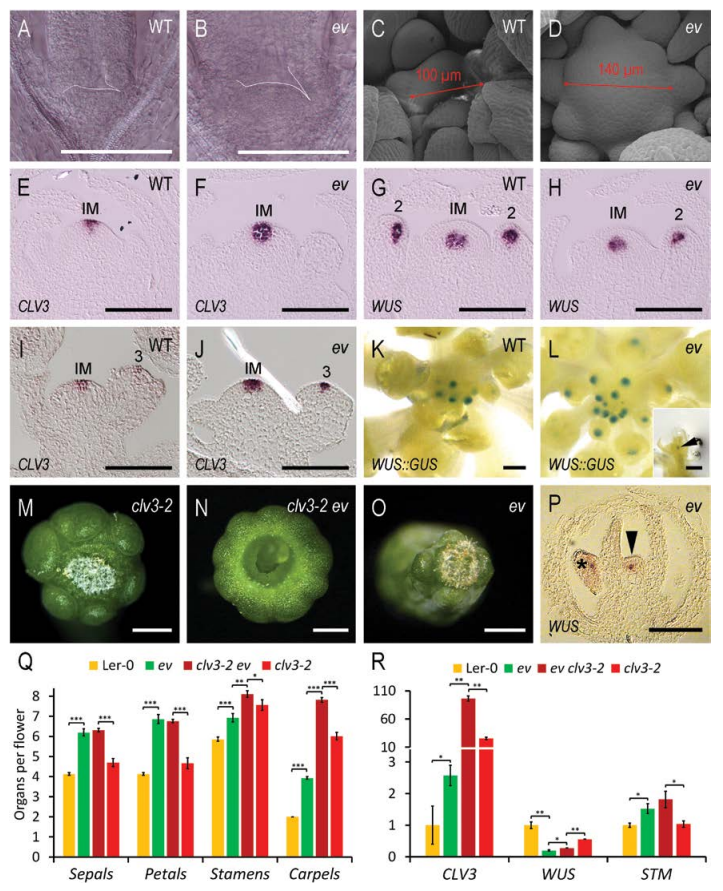 圖4. PcG功能缺失突變體ev與clavata(clv)突變體的遺傳互作分析。A-D,ev與野生型分生組織大小比較;E-J,CLV和WUS基因RNA原位雜交;K-L,WUS::GUS表達(dá)分析;M-O,clv3和ev心皮數(shù)比較;P,ev背景下WUS原位雜交;Q-R,ev和clv3遺傳互作分析。