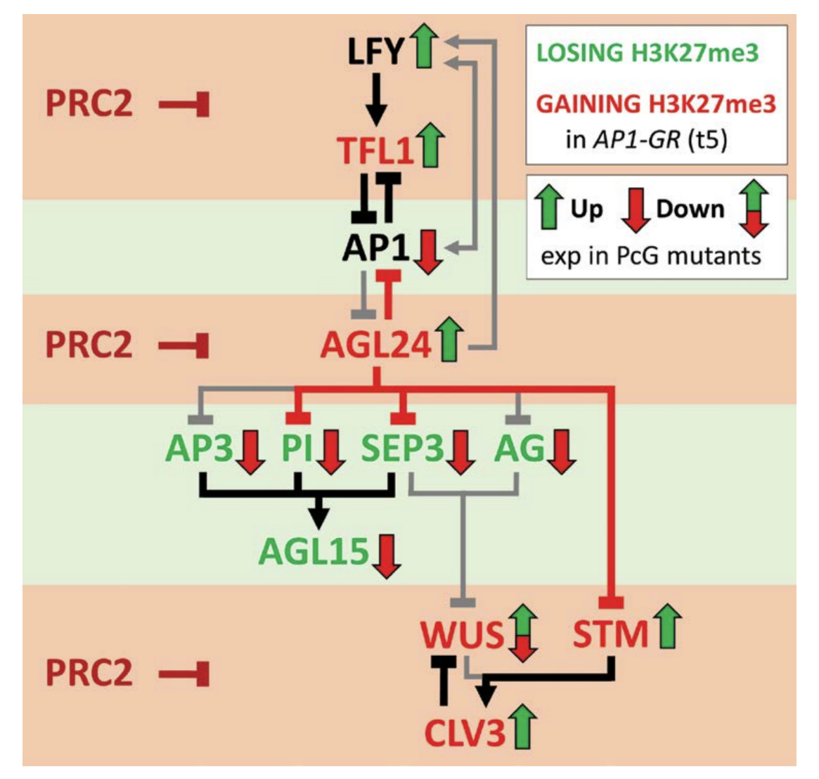 花發(fā)育過程中,Polycomb group(PcG)蛋白介導(dǎo)的組蛋白3賴氨酸27位的3甲基化(H3K27me3)控制著許多發(fā)育調(diào)控因子在時(shí)間和空間上表達(dá)的準(zhǔn)確性?;ǚ稚M織中干細(xì)胞因子WUS的表觀遺傳沉默機(jī)制依賴于PcG蛋白介導(dǎo)的H3K27me3修飾。然而,在花分生組織命運(yùn)決定過程中,H3K27me3介導(dǎo)的其他分生組織調(diào)控因子及細(xì)胞多能性調(diào)控因子的沉默機(jī)制尚未被深入研究。