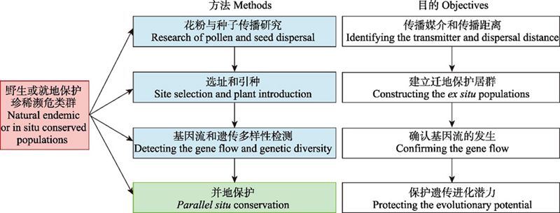并地保護(hù)創(chuàng)新性地實(shí)現(xiàn)了就地保護(hù)與遷地保護(hù)的有機(jī)結(jié)合,通過(guò)構(gòu)建遷地保護(hù)居群與就地保護(hù)或自然居群之間的基因流以達(dá)到保護(hù)植物進(jìn)化潛能的植物保護(hù)方式, 其概念主要是根據(jù)植物居群間基因流動(dòng)態(tài)規(guī)律進(jìn)行保護(hù)物種的遷地保育設(shè)計(jì)(圖3), 其核心是通過(guò)居群間花粉或種子傳播的基因流連接自然居群與遷地保護(hù)居群。因此, 在自然保護(hù)區(qū)等就地保護(hù)區(qū)域內(nèi)或周邊花粉或種子可傳播范圍內(nèi), 建立植物遷地保育圃, 使遷地保護(hù)居群與就地自然居群之間維持基因交流, 即: 將遷地保護(hù)小居群融入自然大居群的基因池并有效維持物種的適應(yīng)性進(jìn)化潛能。該方法對(duì)珍稀瀕危植物尤其重要, 可有效避免植物園遷地小居群的遺傳退化和對(duì)栽培環(huán)境的人為選擇產(chǎn)生的健康度和野外適應(yīng)性降低。并地保護(hù)與其他植物保護(hù)途徑相互補(bǔ)充, 對(duì)實(shí)現(xiàn)生物多樣性保護(hù)具有重要意義。深入的“一種一策”的花粉流檢測(cè)和保育圃設(shè)計(jì)是該方法成功的關(guān)鍵,因此,并地保護(hù)也需要繼續(xù)通過(guò)不同生活型、不同傳媒媒介、不同瀕?;虮Wo(hù)等級(jí)的植物開(kāi)展其保護(hù)效果的驗(yàn)證。