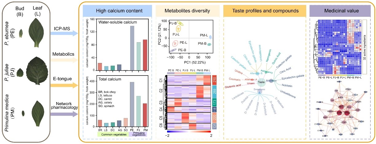 近日,高鈣蔬菜團(tuán)隊(duì)基于對(duì)三個(gè)候選物種鈣富集能力、風(fēng)味特征、藥用潛能等開展高鈣蔬菜質(zhì)量綜合評(píng)價(jià)。同質(zhì)園實(shí)驗(yàn)顯示,報(bào)春苣苔屬高鈣蔬菜具有超強(qiáng)的鈣富集能力,是傳統(tǒng)補(bǔ)鈣蔬菜的10倍以上,其中牛耳朵的鈣含量最高。廣靶代謝組在高鈣蔬菜中共鑒定了1121個(gè)代謝物,不同物種間及同一物種葉片的不同發(fā)育階段,代謝物均有較大的差異,差異代謝物主要包括黃酮類和酚酸類等。電子舌研究鑒定了17個(gè)影響高鈣蔬菜風(fēng)味的物質(zhì),推斷了高鈣蔬菜酸、苦、鮮、甜、咸、澀味及不同回味各自的主要呈味物質(zhì)。網(wǎng)絡(luò)藥理學(xué)在3個(gè)物種中確定了32種活性成分,預(yù)測(cè)了各活性成分潛在的疾病靶點(diǎn),癌癥、心血管疾病等是較為富集的疾病,尤其是藥用報(bào)春苣苔在該方面具有最大的潛力。本研究為報(bào)春苣苔屬高鈣蔬菜育種目標(biāo)選擇和推廣奠定了堅(jiān)實(shí)的基礎(chǔ)。