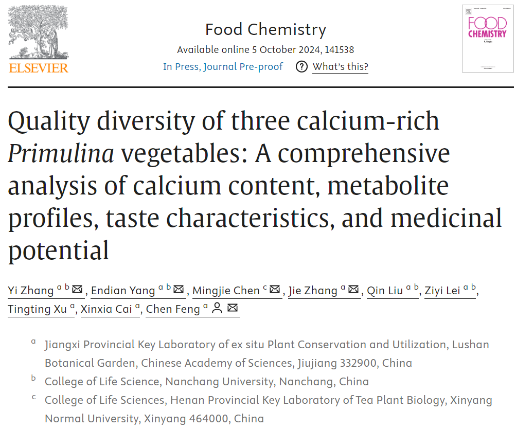 該研究成果以題為“Quality diversity of three calcium-rich Primulina vegetables: A comprehensive analysis of calcium content, metabolite profiles, taste characteristics, and medicinal potential”的論文發(fā)表于食品科學(xué)領(lǐng)域頂級(jí)學(xué)術(shù)期刊Food Chemistry(IF2023=8.5)。廬山植物園植物遷地保護(hù)與利用江西省重點(diǎn)實(shí)驗(yàn)室為本文第一單位和通訊單位,高鈣蔬菜團(tuán)隊(duì)張弋博士為論文第一作者,重點(diǎn)實(shí)驗(yàn)室主任馮晨副研究員為通訊作者,信陽師范大學(xué)茶樹生物學(xué)河南省重點(diǎn)實(shí)驗(yàn)室陳明杰教授等參與了該研究。本研究得到了中國科學(xué)院戰(zhàn)略生物資源計(jì)劃植物種質(zhì)資源創(chuàng)新平臺(tái)項(xiàng)目(KFJ-BRP-007-013)的支持。