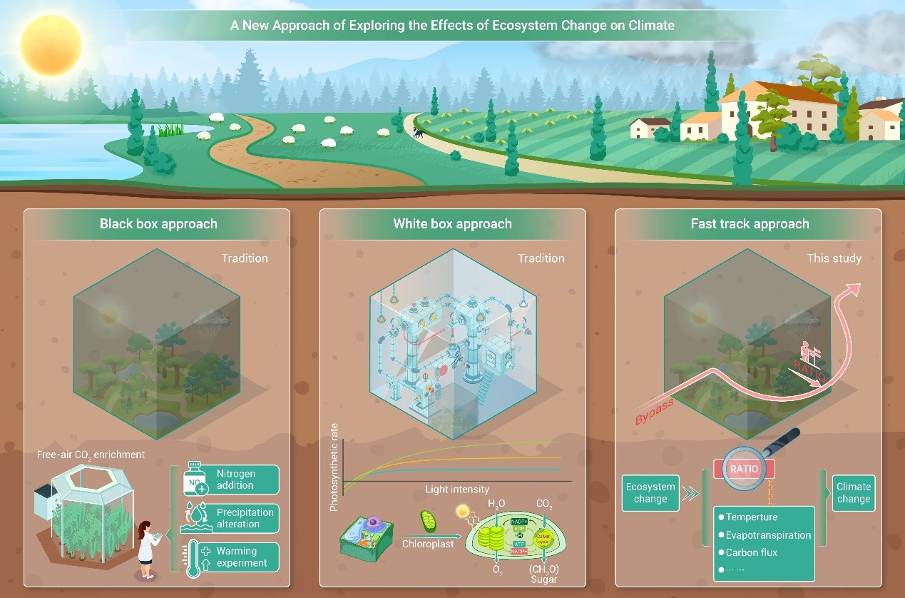 該研究提出了一種全新的“快速通道”途徑。我們關(guān)注黑箱中的過程,但不試圖完全打開它,而是借助一個易觀測的“信使”指標(biāo)—日間與全天水汽通量比(RATIO)。RATIO反映生態(tài)系統(tǒng)變化對氣候的影響,而不是生態(tài)系統(tǒng)變化本身。因此,快速通道途徑從已知的RATIO開始,而不是像黑箱和白箱途徑那樣從生態(tài)系統(tǒng)變化開始。通過這一途徑,能高效捕捉生態(tài)系統(tǒng)復(fù)雜性,并在任意時空尺度下評估和預(yù)測生態(tài)系統(tǒng)變化的氣候效應(yīng)。