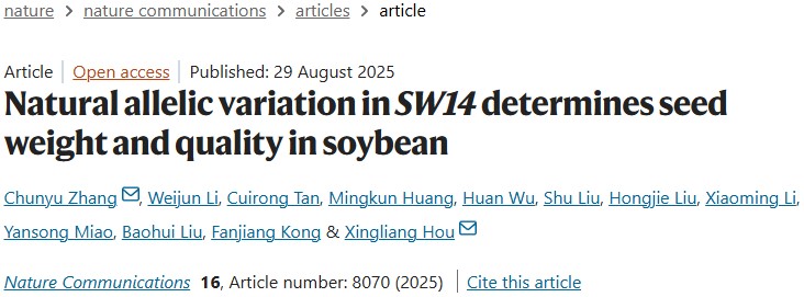 近日,這一領(lǐng)域迎來重要進(jìn)展 —— 國(guó)際知名期刊《Nature Communications》在線發(fā)表了中國(guó)科學(xué)院華南植物園侯興亮團(tuán)隊(duì)與我園黃銘坤團(tuán)隊(duì)合作的研究成果,《Natural allelic variation in SW14 determines seed weight and quality in soybean》(SW14 的自然等位變異決定大豆種子重量與品質(zhì))。