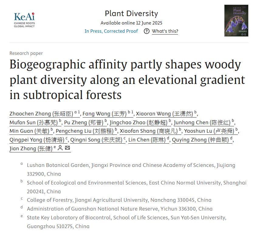 生物多樣性與生態(tài)系統(tǒng)功能研究組在中科院一區(qū)TOP期刊《Plant Diversity》(IF 2025 = 6.3)發(fā)表了“Biogeographic affinity partly shapes woody plant diversity along an elevational gradient in subtropical forests”的研究論文。廬山植物園為本文第一單位,生物多樣性與生態(tài)系統(tǒng)功能研究組張昭臣副研究員為本文第一作者,中山大學(xué)張健教授為本文通訊作者,華東師范大學(xué)、江西農(nóng)業(yè)大學(xué)、官山國(guó)家自然保護(hù)區(qū)等同仁共同參與了該研究。