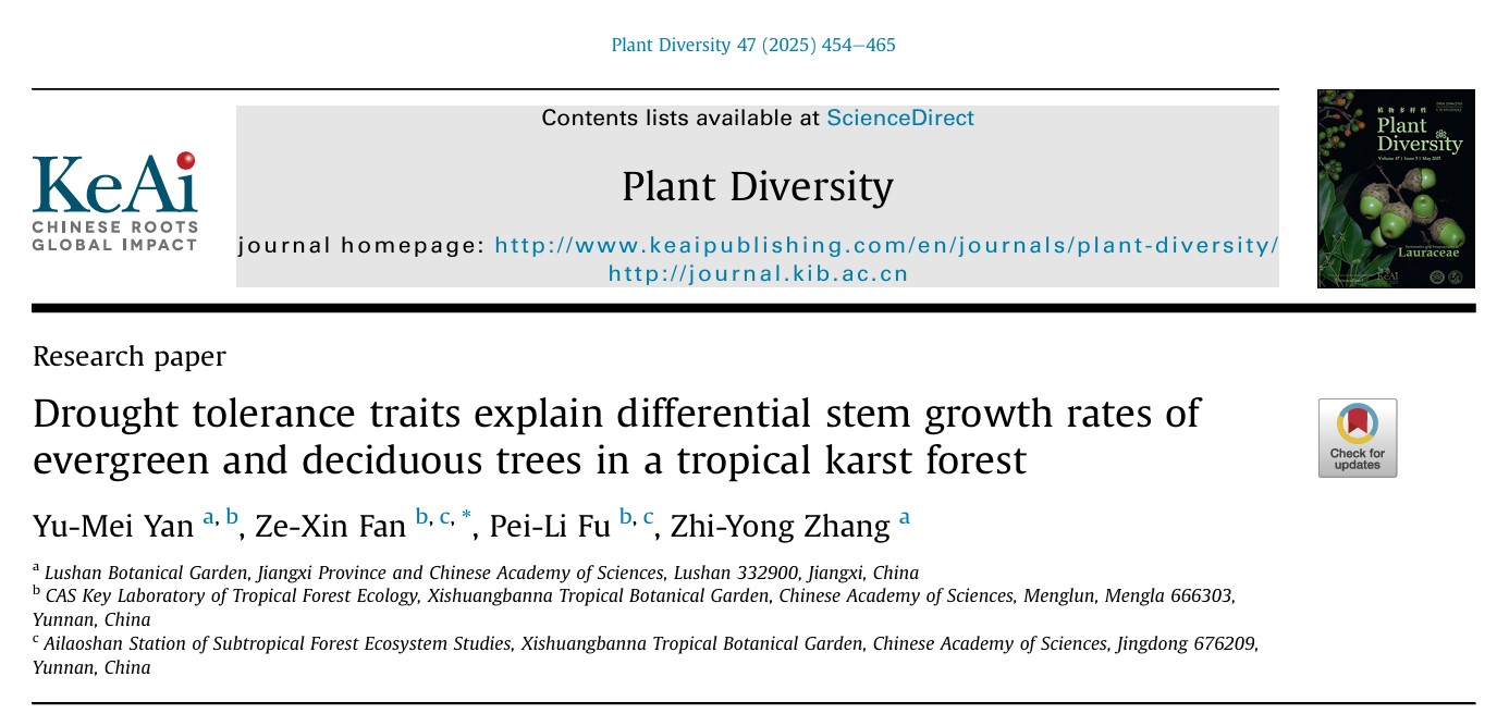 相關(guān)研究結(jié)果以“Drought tolerance traits explain differential stem growth rates of evergreen and deciduous trees in a tropical karst forest”為題發(fā)表在中科院一區(qū)TOP期刊《Plant Diversity》 (IF2025=6.3)。廬山植物園為本文第一署名單位,生態(tài)系統(tǒng)生態(tài)學(xué)研究組閆玉梅博士為本文第一作者,中國(guó)科學(xué)院西雙版納熱帶植物園范澤鑫研究員為本文通訊作者,付培立和張志勇博士共同參與了該研究。本研究得到國(guó)家自然科學(xué)基金項(xiàng)目(3186113307, 31770533, 31870591)、中國(guó)科學(xué)院西部之光人才項(xiàng)目(xbzg-zdsys-202218)等項(xiàng)目的資助。