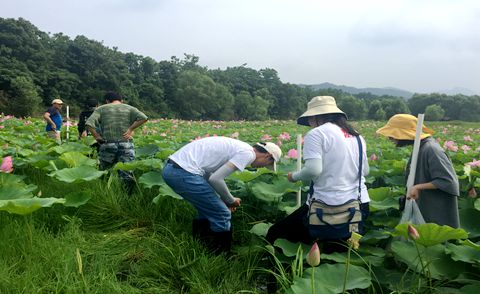 鄱陽湖分園中濕地面積廣闊,主要由湖泊、淺水、濕草甸組成,其中分布著大量的水生和濕生植物,群落結構復雜多樣,水位波動的幅度和頻率顯著影響濕地物種的組成。在今年5月中旬對分園進行植物本底預調(diào)查的基礎上,科研人員選擇了一塊受人類活動干擾較少的自然濕地作為樣地,根據(jù)關鍵環(huán)境因子和主要組成物種的差異設置四條樣帶:分別是荷花樣帶、苔草樣帶、喜旱蓮子草-狗牙根樣帶和白茅樣帶。每條樣帶設置五個1m×1m的樣方,并詳細調(diào)查了這二十個樣方的總蓋度、物種組成、每一物種的蓋度、個體數(shù)、高度等。