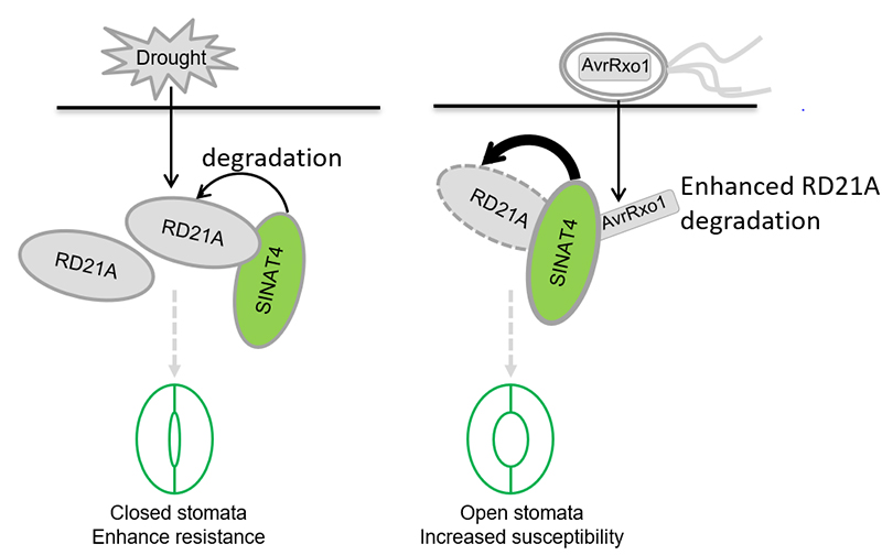我園藥用與功能植物研究組劉毅博士和經(jīng)濟(jì)植物研究組孔丹宇博士等研究發(fā)現(xiàn):干旱處理可以提高植物氣孔免疫反應(yīng),進(jìn)而顯著提高擬南芥對丁香假單胞菌(Pseudomonas syringae pv. tomato DC3000)的抗性。進(jìn)一步研究發(fā)現(xiàn)半胱氨酸蛋白酶RD21A和泛素連接酶SINAT4是這一調(diào)控過程所必須的,其中,SINAT4通過降解RD21A參與干旱增強(qiáng)植物免疫反應(yīng)的信號轉(zhuǎn)導(dǎo)過程。同時(shí),參與植物氣孔免疫反應(yīng)的細(xì)菌III型效應(yīng)因子AvrRxo1可以通過增強(qiáng)SINAT4泛素連接酶活性,促進(jìn)RD21A降解,進(jìn)而降低植物氣孔免疫能力,拮抗干旱誘導(dǎo)的植物免疫力,促進(jìn)細(xì)菌病原菌成功入侵植物。