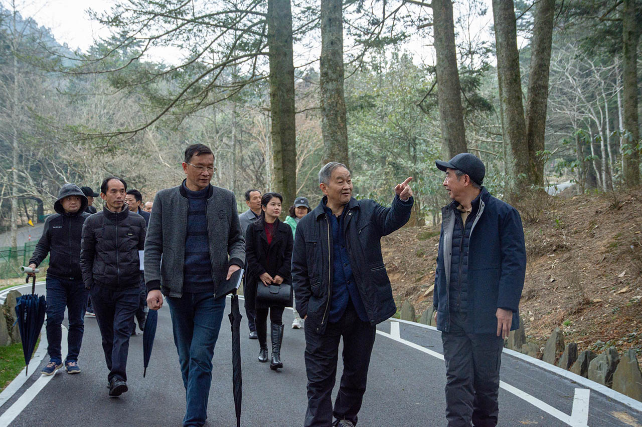 會后,魏輔文一行實地考察了廬山植物園科普館、樹木園、草花區(qū)、模式標本植物專類園以及山南分園,詳細了解廬山植物園遷地植物保護及專類園建設情況。