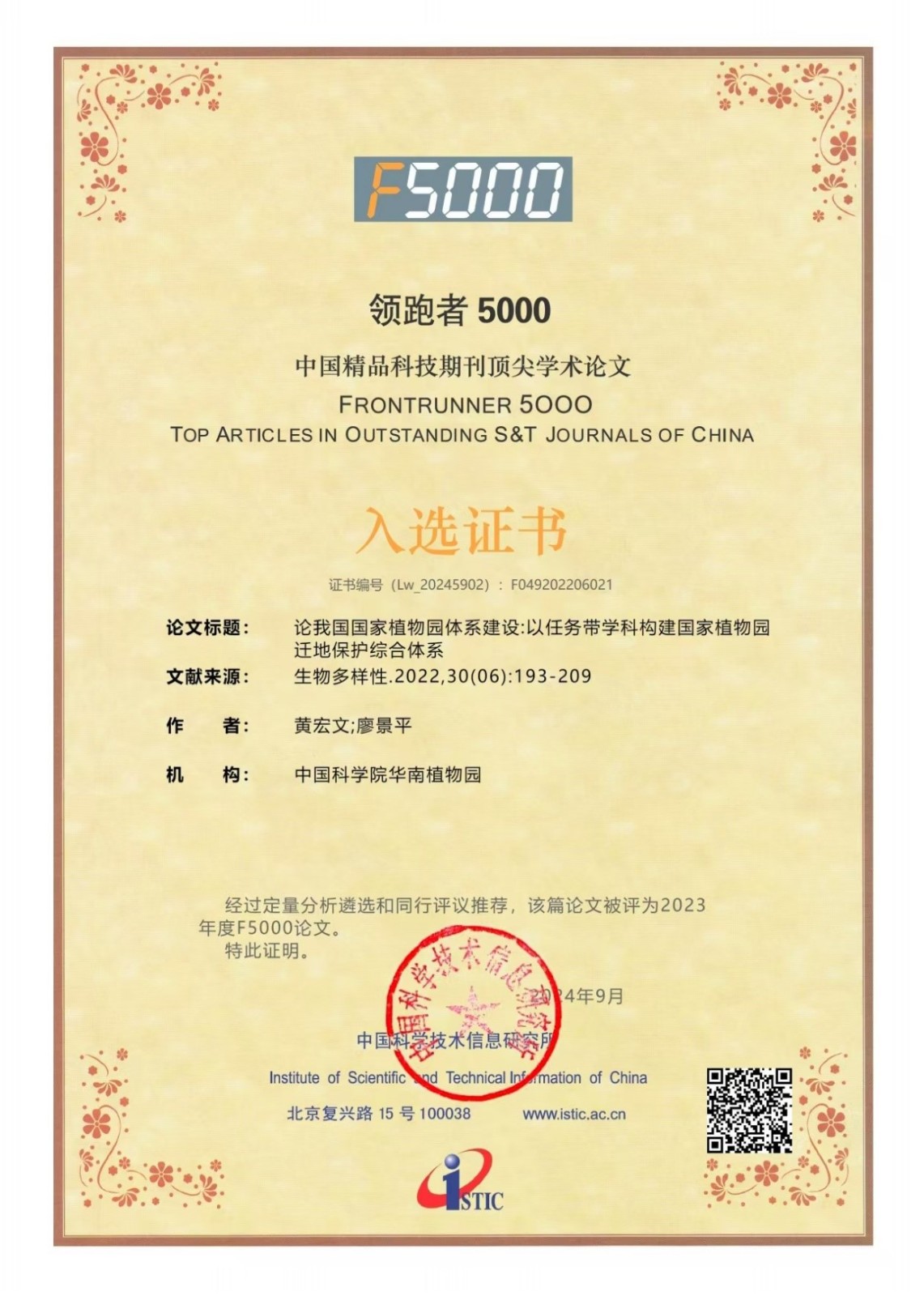 近日,我國權(quán)威科技信息研究機構(gòu)——中國科學(xué)技術(shù)信息研究所發(fā)布了“2023年度中國精品科技期刊頂尖學(xué)術(shù)論文(F5000)”(簡稱F5000),F(xiàn)5000項目通過定量分析遴選和同行推薦相結(jié)合的方式,從中國精品科技期刊中擇優(yōu)選取各學(xué)科前1%高被引論文。廬山植物園主任黃宏文研究員與華南植物園廖景平研究員合作于2022年發(fā)表的《論我國國家植物園體系建設(shè):以任務(wù)帶學(xué)科構(gòu)建國家植物園遷地保護綜合體系》一文入選F5000。