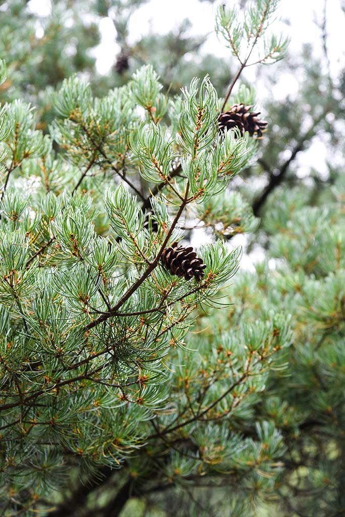 形態(tài)特征:喬木。幼樹(shù)樹(shù)皮光滑,樹(shù)皮褐色,裂成不規(guī)則的鱗狀塊片;冬芽茶褐色,微有樹(shù)脂。針葉5針一束,長(zhǎng)3.5~7 cm,徑1~1.5 mm,先端尖,邊緣有疏生細(xì)鋸齒,僅腹面每側(cè)有4~5條白色氣孔線;橫切面三角形;葉鞘早落。球果柱狀矩圓形或圓柱狀卵形,通常單生,熟時(shí)淡紅褐色,梗長(zhǎng)0.7~2 cm;種鱗楔狀倒卵形,鱗盾菱形,先端邊緣較薄,微內(nèi)曲或直伸;種子橢圓形或倒卵形。花期4~5月,球果第二年10月成熟。