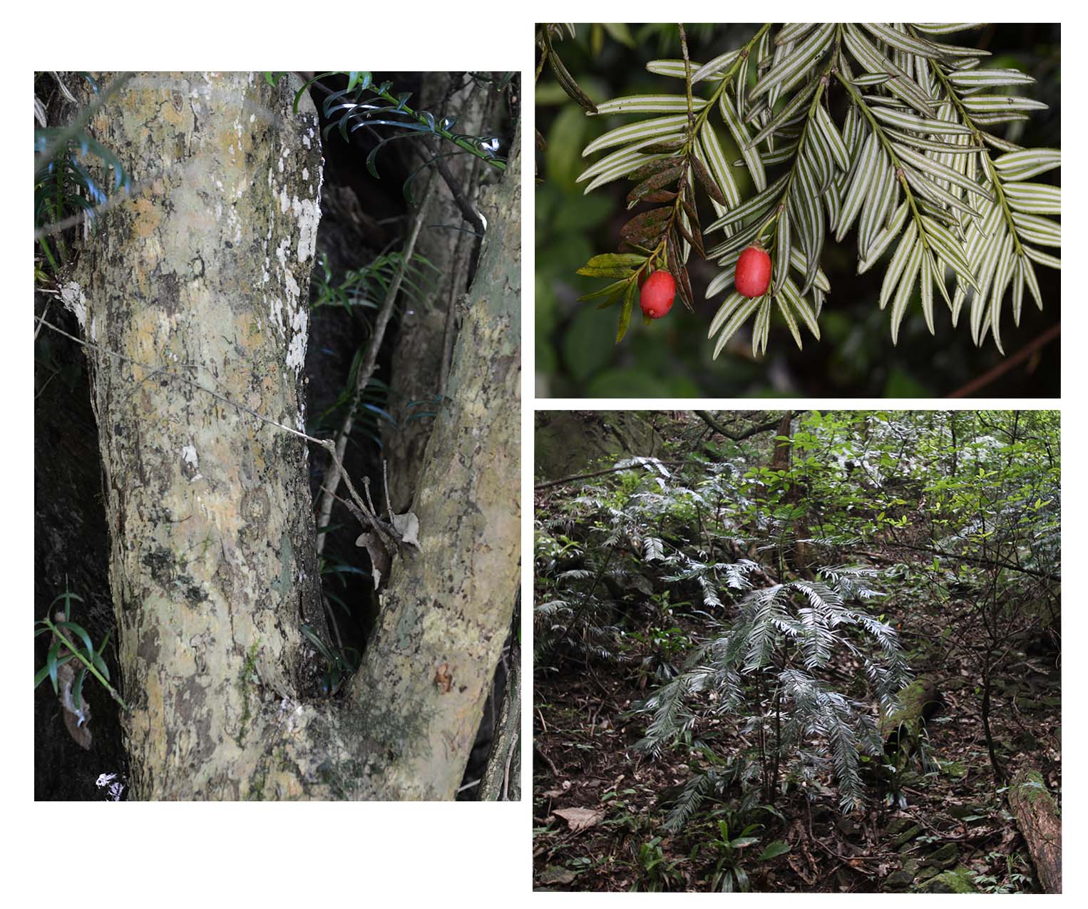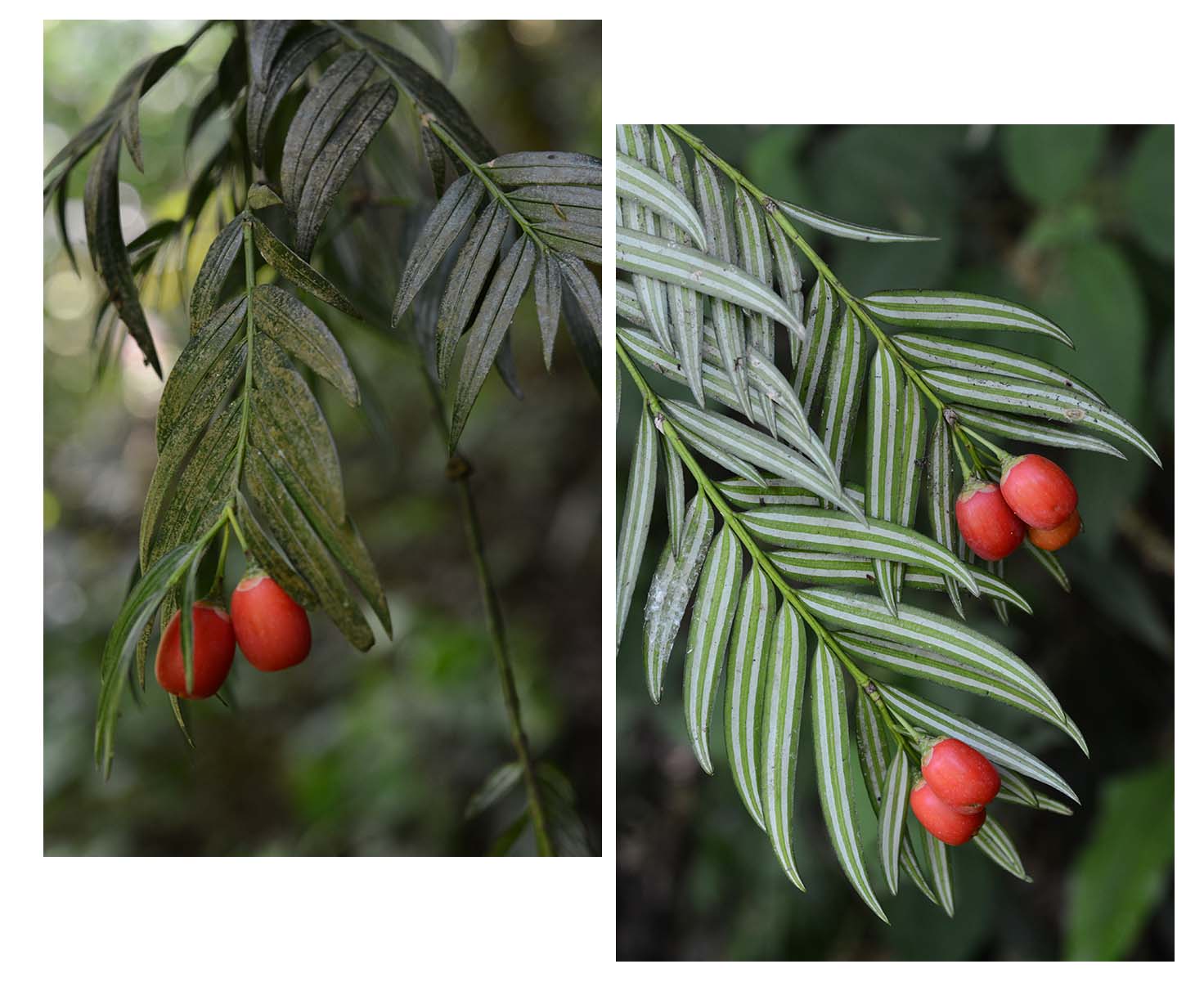 識別要點:葉二列,條狀披針形,背面具兩條寬的白色氣孔帶;種子成熟時紅色假種皮全包。