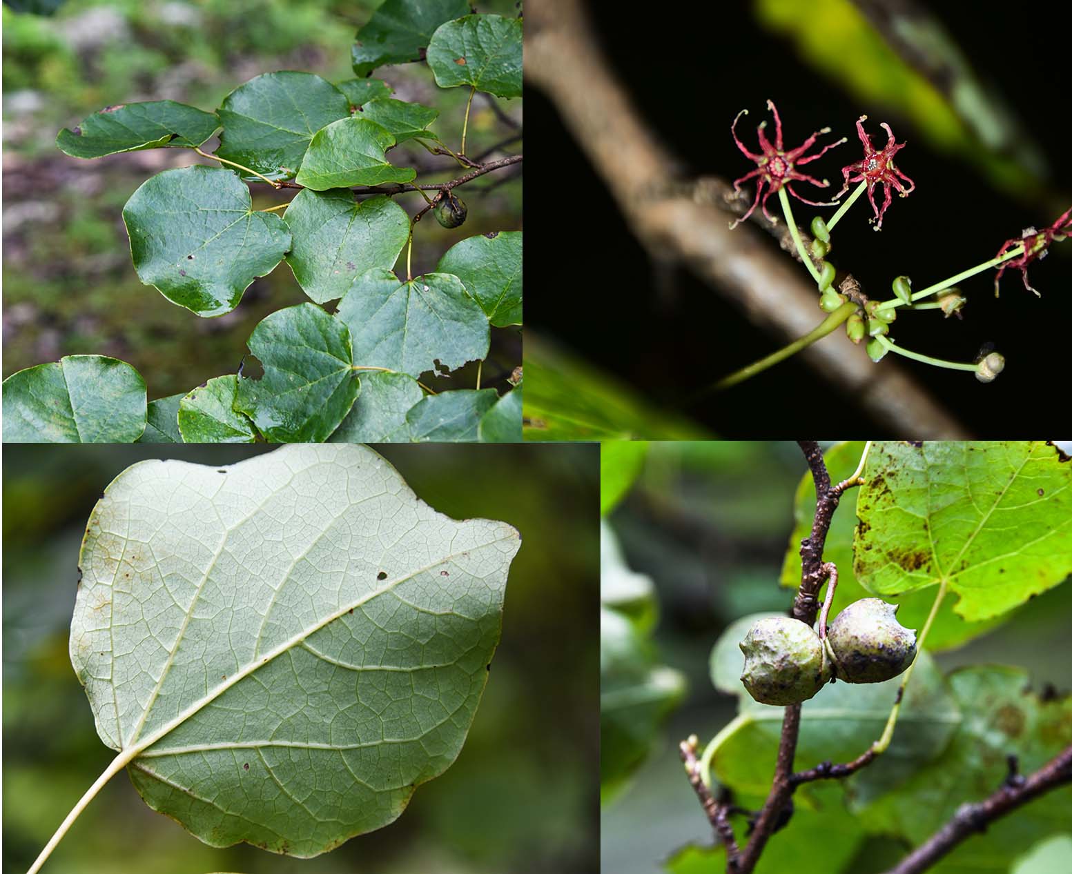 形態(tài)特征:落葉灌木,多分枝,小枝屈曲,褐色,無毛,有細(xì)小皮孔。葉膜質(zhì),寬度大于長度,闊卵圓形,長5~8 cm,寬6~9 cm,先端鈍或?yàn)閳A形,基部心形,上面綠色無光澤,背部不具灰色,無毛,掌狀脈5~7條,全緣;葉柄長3~5 cm,無毛。頭狀花序腋生,花開放時(shí)反卷;花瓣紅色,狹長帶形,長約7 mm。蒴果倒卵形;果序柄較長,約長1.5~3.2 cm。種子長4~5 mm,黑色,有光澤?;ㄆ?/span>10~12月。