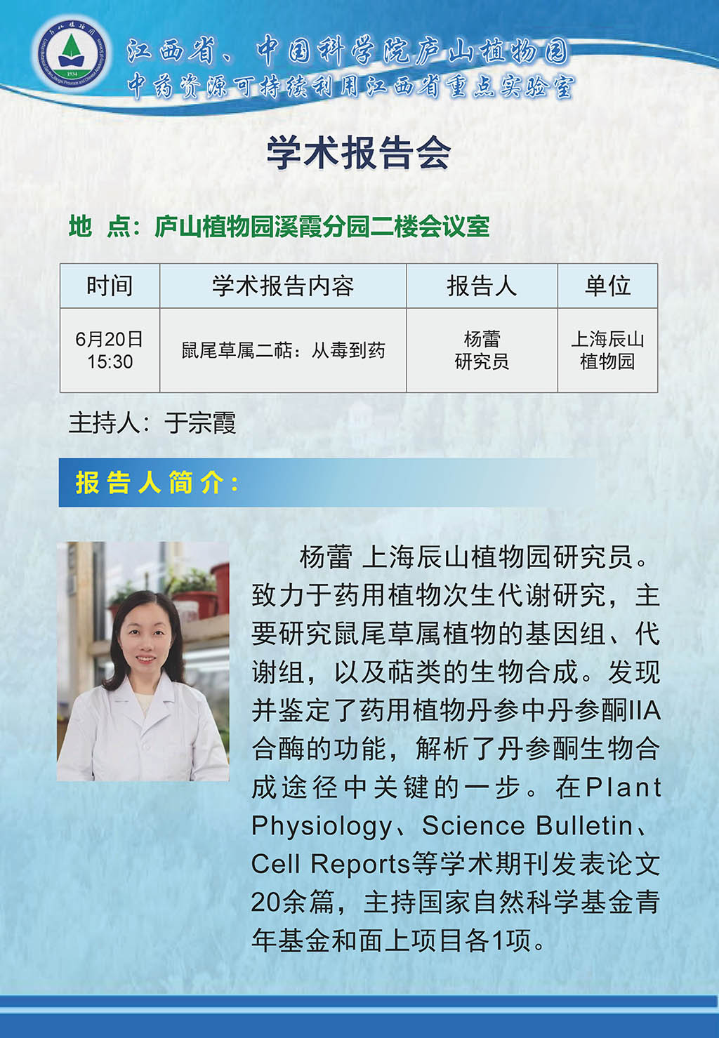 楊蕾 上海辰山植物園研究員。致力于藥用植物次生代謝研究,主要研究鼠尾草屬植物的基因組、代謝組,以及萜類的生物合成。發(fā)現(xiàn)并鑒定了藥用植物丹參中丹參酮IIA合酶的功能,解析了丹參酮生物合成途徑中關(guān)鍵的一步。在Plant Physiology、Science Bulletin、Cell Reports等學(xué)術(shù)期刊發(fā)表論文20余篇,主持國家自然科學(xué)基金青年基金和面上項(xiàng)目各1項(xiàng)。