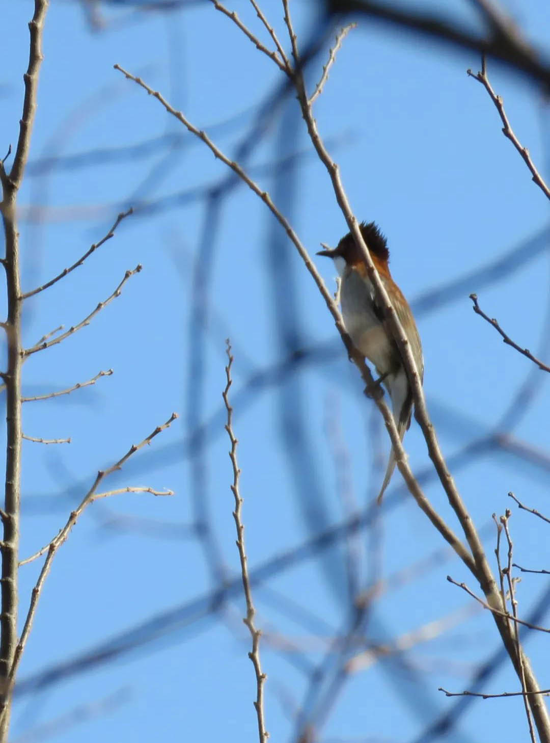 隨著氣溫上升、春意漸濃,植物園的留鳥和夏候鳥開始了求偶與繁殖,園子里也開始熱鬧起來。白頭鵯是植物園里最活躍和常見的鳥類之一,全年幾乎都可以聽到它們在樹冠之間的鳴唱。白頭鵯的分布區(qū)在最近幾十年隨著氣候變化不斷北擴,已經(jīng)成為了東部城市中最常見的“菜鳥”之一。栗背短腳鵯是植物園的另一種常見鵯類,偶爾會見到與白頭鵯混群,冬季常常在園內(nèi)取食果實,春季多棲息在園內(nèi)一座未開發(fā)的小山上的密林中。盡管它們的棲息地相對隱蔽,但你仍然可以清晰地聽到它們那極具特色的三音節(jié)鳴唱,這聲音在春日的植物園中尤為動聽。白頭鵯 (Pycnonotus sinensis)