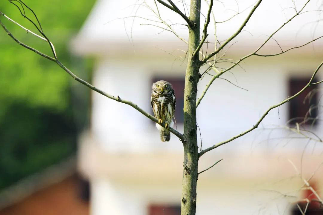啄木鳥被稱作“生態(tài)工程師”,這是因為它們鑿出的洞巢不僅用于自身繁殖,還為許多其他動物提供了巢穴。斑頭鵂鹠(xiū liú)就是這樣的一種動物,據(jù)報道,它們常在天然樹洞或啄木鳥的空巢中繁殖。這些小型貓頭鷹主要以昆蟲和其他小動物為食。在植物園中,我們偶爾能在密林邊緣觀察到斑頭鵂鹠棲息在樹上。它們非常警覺,一旦察覺到人類靠近便會迅速飛走。這種小心翼翼的行為使得斑頭鵂鹠雖然不易被近距離觀察,但每一次偶遇都顯得格外珍貴。斑頭鵂鹠 (Glaucidium cuculoides)