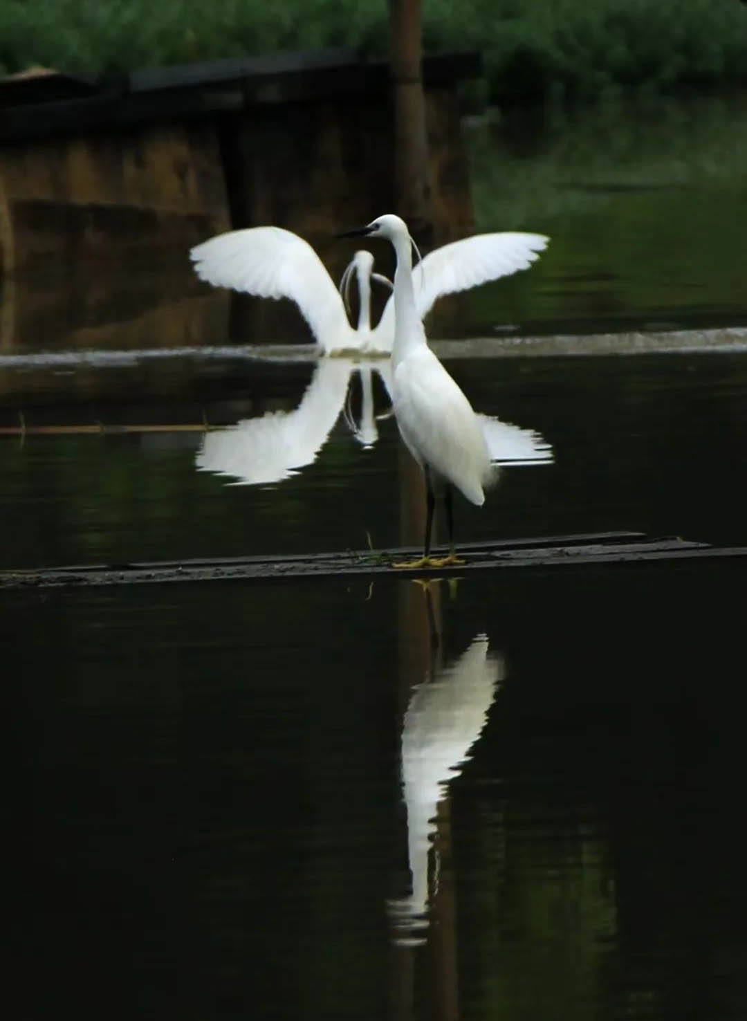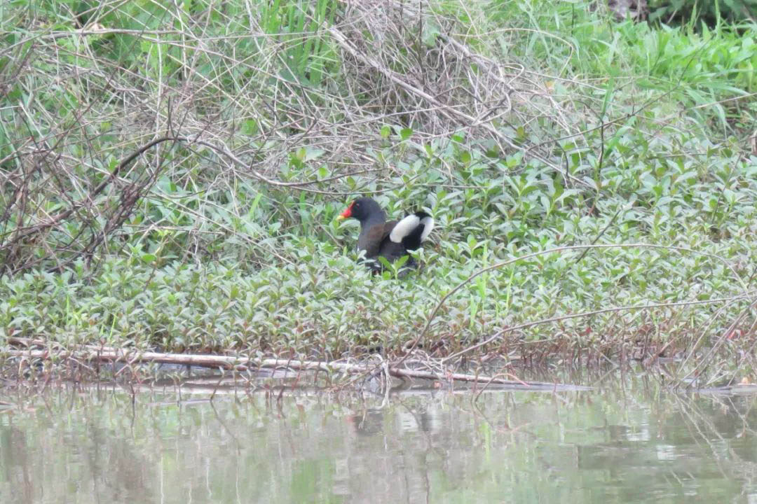 湖邊的茂盛植被構(gòu)成了黑水雞的理想生境。這些鳥類以各種水生植物和動物為食,具有良好的游泳和潛水能力。不過,它們在游泳時頭頸會隨著每一次劃水而前傾,給人一種看似費力的印象。黑水雞在種內(nèi)展現(xiàn)了有趣的巢寄生行為,即一些個體會將自己的部分卵產(chǎn)在鄰居的巢中,讓鄰居幫忙孵化和撫養(yǎng)。這一行為在許多鳥類中都存在,但黑水雞因為十分常見,且不同雌性產(chǎn)的卵外觀區(qū)別較大而成為研究種內(nèi)巢寄生的理想物種,受到了深入的研究。湖邊不僅有黑水雞,還有白骨頂、紅腳苦惡鳥和白胸苦惡鳥等秧雞家族的其他成員。此外,白鷺、蒼鷺、夜鷺和池鷺等鷺類也常在這里覓食,它們在湖邊捕魚的身影是這個生態(tài)系統(tǒng)中一道亮麗的風景線。黑水雞 (Gallinula chloropus)