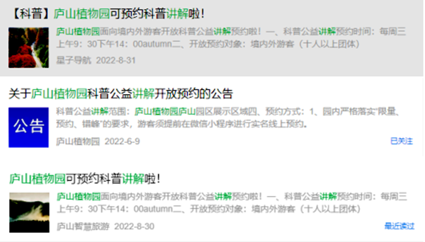 同時,廬山植物園與廬山旅發(fā)委合作,把講解預(yù)約公告在廬山游客服務(wù)中心、廬山智慧旅游平臺、廬山植物園網(wǎng)站和公眾號進(jìn)行發(fā)布,公眾可以通過多渠道預(yù)約。