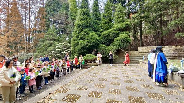 在水杉林前,科普部研學(xué)老師聶建波向參加活動(dòng)的學(xué)生們介紹了水杉發(fā)現(xiàn)的意義與植物園創(chuàng)始人胡先骕先生淵源的故事;在中心景區(qū),聶老師向大家介紹了陳封懷先生的造園藝術(shù)與成就;在槭樹(shù)園,聶老師帶領(lǐng)學(xué)生欣賞廬山秋如醉的最佳景色,用自然之美影響孩子們,讓他們體悟萬(wàn)物生長(zhǎng)的蓬勃力量。在陳寅恪墓和三老墓前,聶老師用大師的真實(shí)生平故事,實(shí)實(shí)在在告訴孩子們,什么是科學(xué)精神,什么是民族自強(qiáng)的決心,希望每一個(gè)孩子以胡先骕、秦仁昌、陳封懷三位植物學(xué)家和國(guó)學(xué)大師陳寅恪為典范,牢記科技創(chuàng)新必備的品質(zhì):“獨(dú)立之精神,自由之思想”。最后參加活動(dòng)的孩子們?cè)诼櫪蠋煄ьI(lǐng)下向“三老”獻(xiàn)花以表達(dá)敬意。