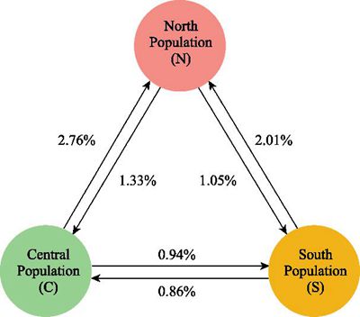 圖2 江西省廬山國(guó)家級(jí)自然保護(hù)區(qū)不同小葉青岡居群間的雜交率。箭頭表示花粉傳播方向, 數(shù)字表示該花粉傳播方向造成的雜交率。