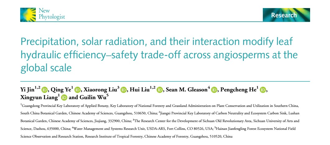 該研究從全球尺度揭示了葉片水力效率和安全性權(quán)衡關(guān)系以及驅(qū)動(dòng)其變化的生理生態(tài)機(jī)制,為研究被子植物的水力適應(yīng)策略提供了新的觀點(diǎn),對(duì)探究植物的適應(yīng)機(jī)制和分布具有重要意義。相關(guān)研究結(jié)果以“Precipitation, solar radiation, and their interaction modify leaf hydraulic efficiency-safety trade-off across angiosperms at the global scale”為題在線發(fā)表于國(guó)際主流刊物New Phytologist(IF5-year=10.2),第一作者為廬山植物園生態(tài)系統(tǒng)生態(tài)學(xué)研究組助理研究員金益,通訊作者為華南植物園葉清研究員。該研究得到了國(guó)家自然科學(xué)基金、中國(guó)科學(xué)院青年創(chuàng)新促進(jìn)會(huì)等資助。