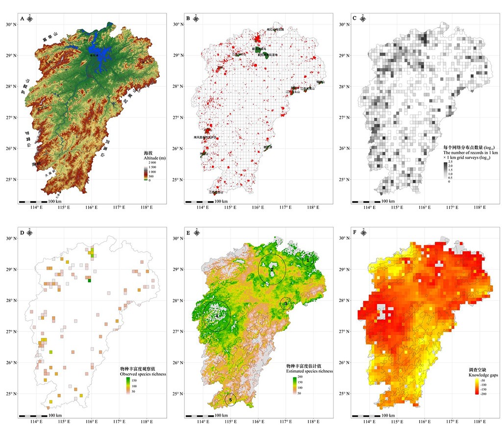 A. 江西省的范圍和地形; B. 江西省重點(diǎn)保護(hù)植物的分布點(diǎn)(紅色點(diǎn)), 國(guó)家級(jí)自然保護(hù)區(qū)(深綠色多邊形), 省級(jí)自然保護(hù)(淺綠色多邊形)和1 km × 1 km網(wǎng)格分布; C. 1 km × 1 km 網(wǎng)格調(diào)查記錄數(shù)量分布(log10轉(zhuǎn)換); D. 物種豐富度觀察值≥50的網(wǎng)格分布; E. 物種豐富度估計(jì)值≥50的網(wǎng)格分布; F. 1 km × 1 km網(wǎng)格調(diào)查空缺分布。
