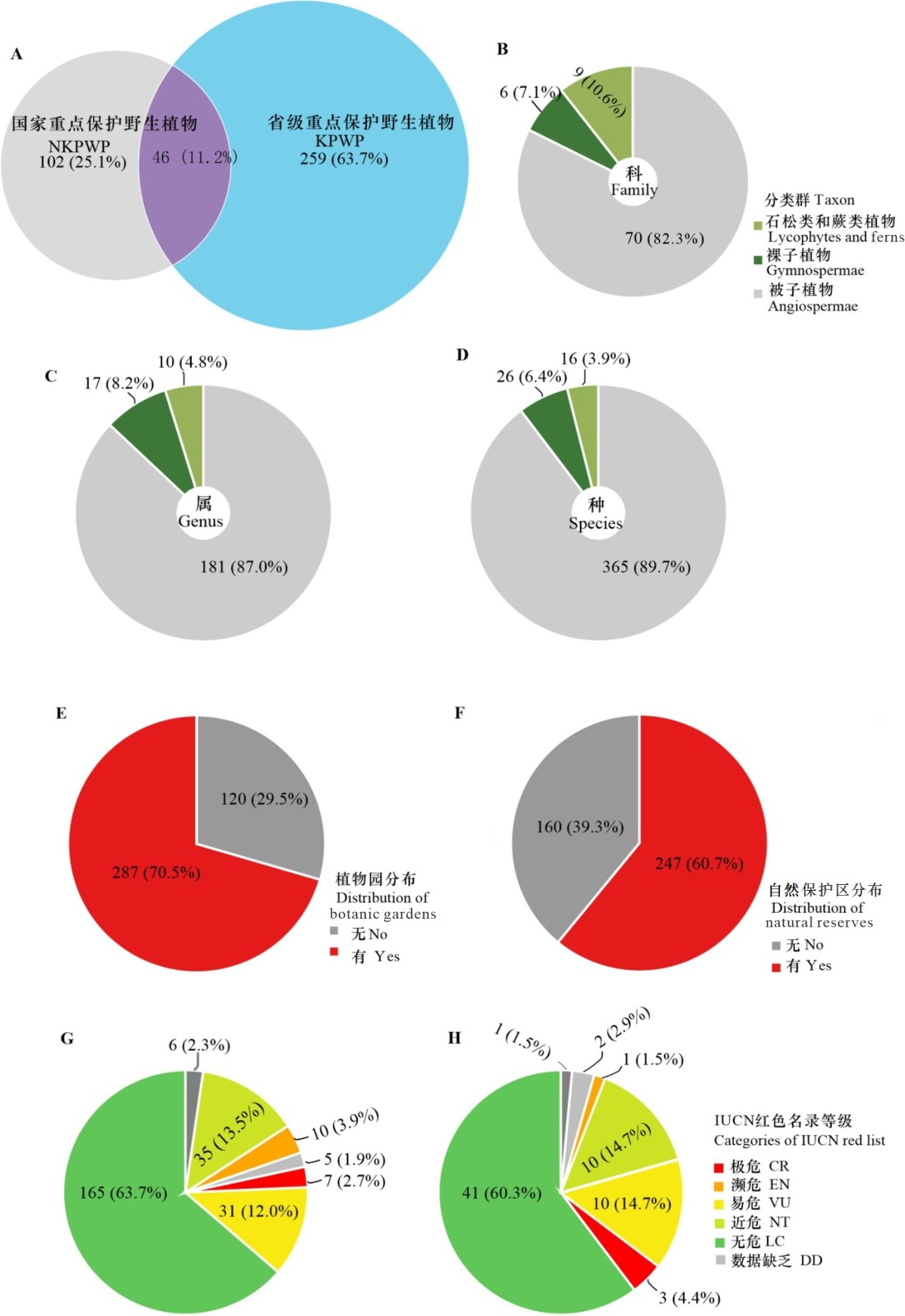 A. 江西省分布的國(guó)家重點(diǎn)保護(hù)植物(NKPWP)和省級(jí)重點(diǎn)保護(hù)植物(KPWP)種類組成差異; B-D. 重點(diǎn)保護(hù)植物中石松和蕨類、裸子植物和被子植物的科屬種組成和比例; E、F. 重點(diǎn)保護(hù)植物在植物園和保護(hù)區(qū)分布的種類數(shù)量和比例; G、H. 259種省級(jí)重點(diǎn)保護(hù)植物和其中68種中國(guó)特有種的紅色名錄評(píng)估等級(jí)組成。