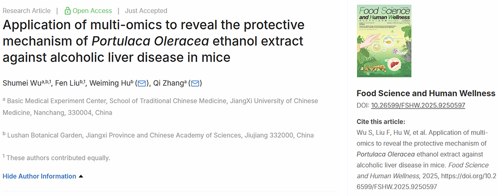 相關(guān)研究成果于2025年4月18日在《Food Science and Human Wellness》(中科院1區(qū),IF=5.6)學術(shù)期刊發(fā)表,題目為“Application of multi-omics to reveal the protective mechanism of Portulaca Oleracea ethanol extract against alcoholic liver disease in mice”。我園與江西中醫(yī)藥大學聯(lián)合培養(yǎng)碩士研究生吳淑妹和我園劉芬研究員為論文的第一作者和共同第一作者,江西中醫(yī)藥大學張琦教授和我園胡偉明研究員為論文的通訊作者。