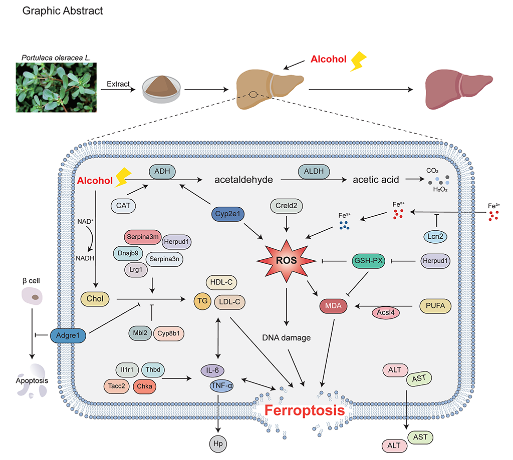 近日,江西省、中國科學院廬山植物園植物生理研究組(劉芬研究員團隊)與江西中醫(yī)藥大學張琦教授團隊合作,驗證了馬齒莧乙醇提取物(POE)是治療小鼠酒精性肝?。ˋLD)的有效手段,通過轉(zhuǎn)錄組學聯(lián)合蛋白質(zhì)組學技術(shù),揭示了POE對酒精性肝損傷改善作用的作用機制,并為開發(fā)具有有益效果的新治療方法提供特定的靶點和途徑,為臨床開發(fā)護肝藥物提供思路和參考。