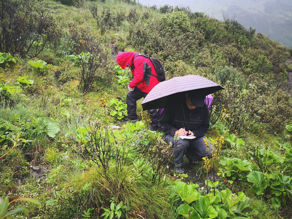 7月25日-8月2日,我園科技人員張志勇博士和李單琦助理研究員在四川省林業(yè)科學(xué)研究院謝大軍副研究員的協(xié)助下完成了四川理縣及其周邊地區(qū)風(fēng)媒植物的空間分布情況的調(diào)查任務(wù)??疾煨〗M成員克服高原反應(yīng)等重重困難,期間曾冒雨在海拔4077米高山灌木叢采集表土和苔蘚樣品。此次考察采樣任務(wù)跨越海拔2600-4077米,共采集表土樣品58份和苔蘚樣品31份(含備份樣品),并詳細(xì)記錄了采樣點(diǎn)周邊植物種類,為下一步深入研究奠定了基礎(chǔ)。此次考察是在國(guó)家自然科學(xué)基金項(xiàng)目‘川西北地區(qū)風(fēng)媒植物花粉空間分布格局和傳播動(dòng)力機(jī)制’(41861003) 支持下完成的。