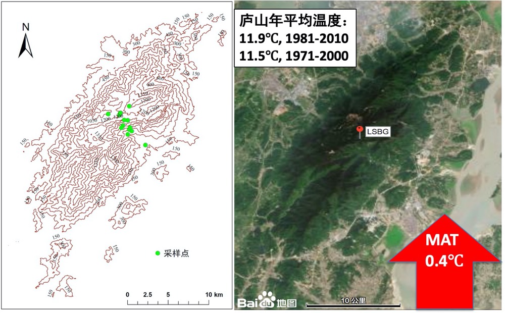 廬山植被在近60多年以來,經歷了從局部植被被人類活動所破壞到逐漸受到保護再恢復的過程,期間人工造林對廬山原始植被的演替和恢復也發(fā)揮了一定作用;而且,近幾十年來,廬山地區(qū)年平均溫度 (MAT) 有所升高,升溫幅度大約在0.4度左右,這些都可能對廬山本土植物在垂直方向上的分布范圍有或大或小的影響。