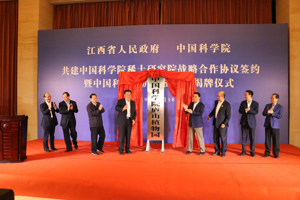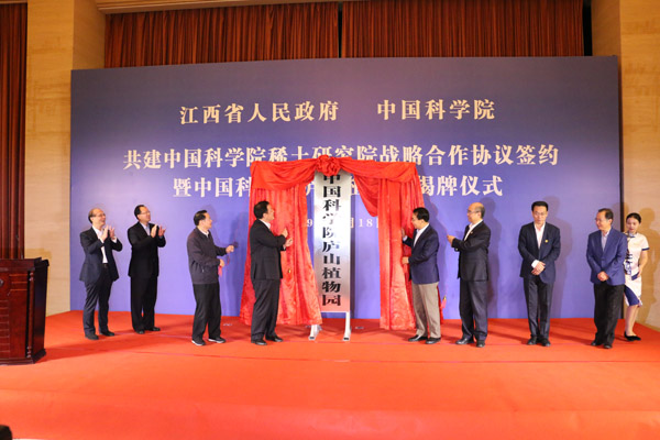 2019年10月18日,江西省人民政府與中國科學院共建中國科學院稀土研究院戰(zhàn)略合作協(xié)議簽約暨中國科學院廬山植物園揭牌儀式在南昌前湖迎賓館井岡山廳舉行。江西省委常委、常務副省長毛偉明主持會議,省委書記劉奇,中科院院長白春禮,省長易煉紅,副省長吳曉軍,中科院副院長相里斌等領導出席并揭牌。