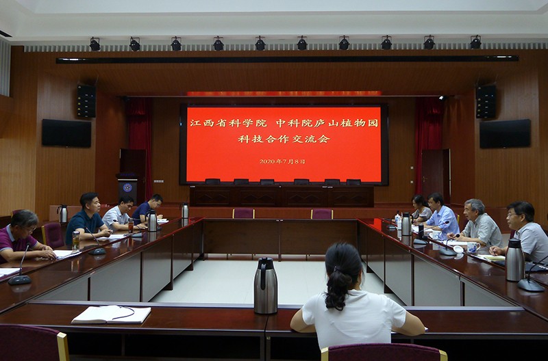 2020年7月8日下午,廬山植物園黃宏文主任、詹選懷書記一行赴省科學院洽談科技合作。省科學院黨組書記、院長熊紹員,黨組成員、副院長魏國汶出席會議。