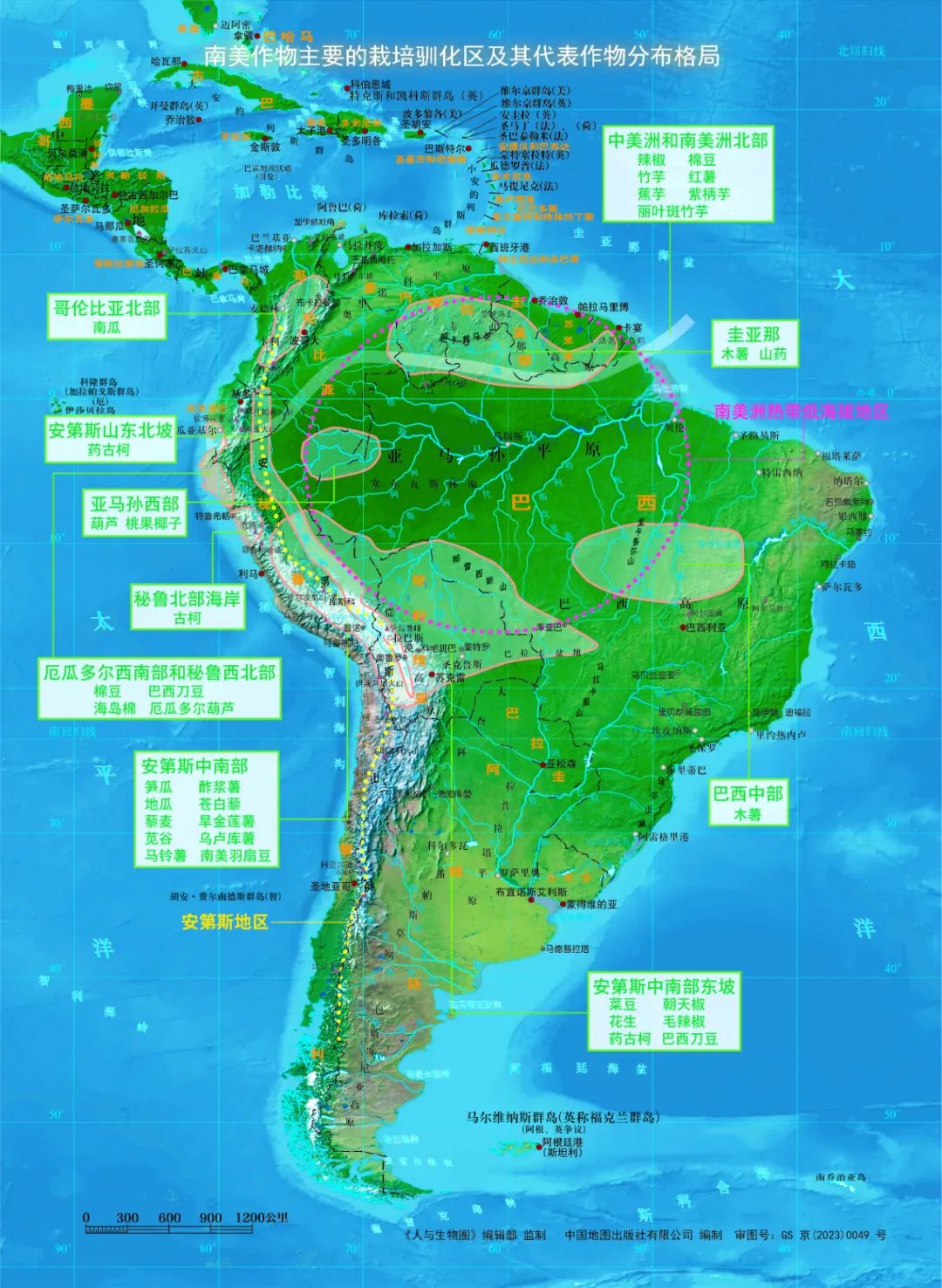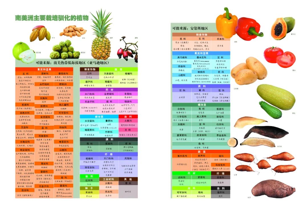 由于自然地理條件、植被和生態(tài)環(huán)境迥異,南美栽培馴化植物的利用各有特點。一般將這些植物的地理來源歸納為:安第斯地區(qū),主要類群包括塊莖類(如馬鈴薯)和類谷物(如藜麥)等多年生草本植物;亞馬遜地區(qū)(即熱帶低海拔地區(qū)),主要涉及木質(zhì)化的果樹(如菠蘿)。初略統(tǒng)計,原產(chǎn)南美的栽培馴化植物總計52科127屬219種,其中68種來自安第斯地區(qū),151種來自亞馬遜地區(qū)。南美安第斯地區(qū)是世界上最重要的植物馴化起源地之一,塊莖植物馴化是其顯著的特征。馬鈴薯顯然在安第斯地區(qū)首先得以栽培馴化,具體時間地點可追溯到距今7000~1萬年的秘魯高原和玻利維亞北部。古生態(tài)學(xué)證據(jù)表明,安第斯地區(qū)的植物馴化始于距今9000~7000年前。最早馴化的植物有葫蘆科南瓜屬的種類(距今5000~4000年前),包括筍瓜、黑籽南瓜、南瓜和厄瓜多爾葫蘆。安第斯地區(qū)原住民獲取的含碳水化合物的主食以類谷物和根莖類植物為主,它們由此形成了對世界有重要影響的兩大類栽培馴化植物。值得說明的是,類谷物作物包括藜科的藜麥和蒼白藜,以及莧科的莧谷。至于安第斯山地原住民栽培馴化的根莖類植物,在茄科的馬鈴薯之外還有美人蕉科的蕉芋、酢漿草科的酢漿薯、落葵科的烏盧庫薯和旱金蓮科的旱金蓮薯等。據(jù)估計,在歐洲人到來前,亞馬遜地區(qū)的原住民人口已達四五百萬,他們對至少138種植物有豐富的栽培利用經(jīng)驗。該地區(qū)馴化了南美特有的重要糧食作物之一的木薯(隸屬大戟科),其馴化史至少有4000多年;在相近的地區(qū),豆科落花生屬的花生也有約3800年的馴化史。同時,對不適宜生長在高寒地區(qū)的美人蕉科的蕉芋和竹芋科的竹芋,也在亞馬遜平原地區(qū)獲得栽培馴化。南美在果樹植物的馴化史上具有重要地位,除了人們熟知的鳳梨科的菠蘿、棕櫚科的刺棒棕和錦葵科的大花可可樹等,南美廣大地區(qū)還栽培馴化了許多茄科水果類植物,如酸漿屬的燈籠果,以及茄屬的人參果、樹番茄和龍葵。智利辣椒在安第斯地區(qū)有長達6000年的利用歷史,目前廣泛栽培的種類包括朝天椒、毛辣椒和黃燈籠辣椒(中國辣椒)。有兩類重要的藥用植物古柯和煙草分別來自安第斯和亞馬遜地區(qū)。安第斯馴化的棉花(海島棉)可能來自當?shù)匾吧问剑煌谥忻乐揆Z化的陸地棉。