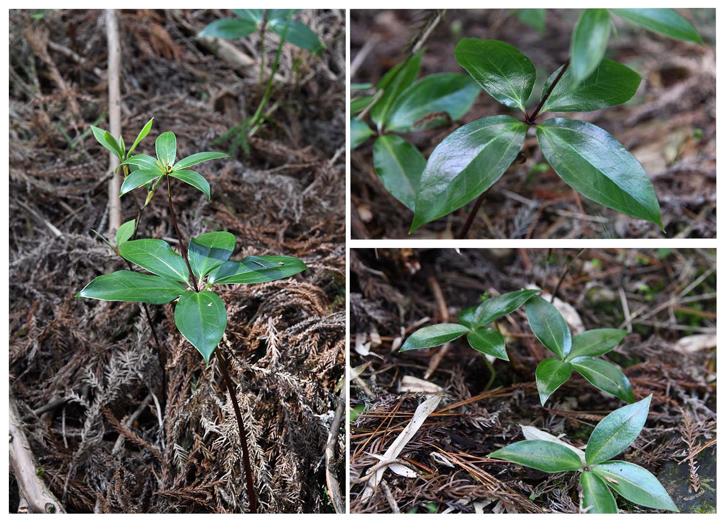 識(shí)別要點(diǎn):葉4-5片輪生,葉面具光澤,近革質(zhì),三出脈中脈明顯,網(wǎng)脈不明顯,花瓣為萼片的1/2長。