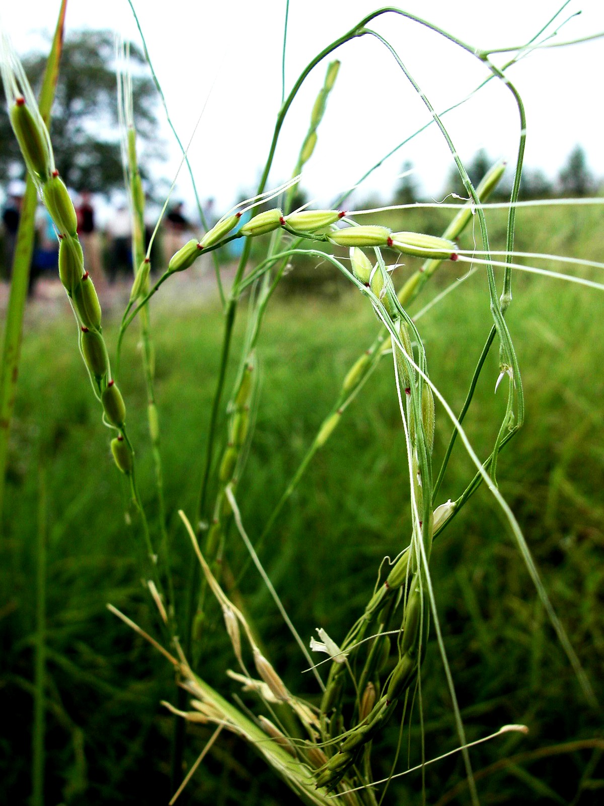 形態(tài)特征:多年生水生草本。稈高約1.5米,下部海綿質(zhì)或于節(jié)上生根。葉鞘圓筒形,疏松、無(wú)毛;葉舌長(zhǎng)達(dá)17mm;葉耳明顯;葉片線形、扁平。圓錐花序長(zhǎng)約20cm,直立而后下垂;主軸及分枝粗糙;小穗長(zhǎng)8-9mm,基部具2枚微小半圓形的退化穎片;成熟后自小穗柄關(guān)節(jié)上脫落;孕性外稃長(zhǎng)圓形厚紙質(zhì),長(zhǎng)7-8mm,具5脈,遍生糙毛狀粗糙,沿脊上部具較長(zhǎng)纖毛;芒著生于外稃頂端并具一明顯關(guān)節(jié),長(zhǎng)5-40mm不等;內(nèi)秤與外稃同質(zhì),被糙毛,具3脈;鱗被2枚;雄蕊6,花藥長(zhǎng)約5mm;柱頭2,羽狀。穎果長(zhǎng)圓形,易落粒?;ü?/span>4-5月和10-11月。染色體2n=24,染色體組AA型,x=12。