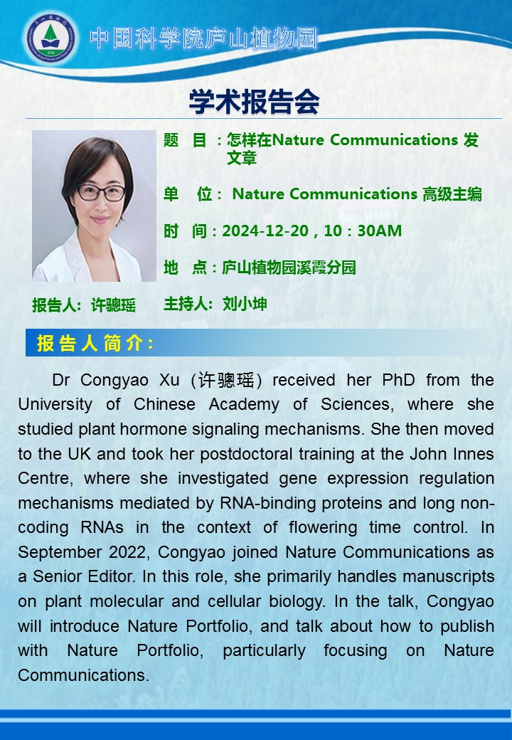 Dr Congyao Xu (許驄瑤) received her PhD from the University of Chinese Academy of Sciences, where she studied plant hormone signaling mechanisms. She then moved to the UK and took her postdoctoral training at the John Innes Centre, where she investigated gene expression regulation mechanisms mediated by RNA-binding proteins and long non-coding RNAs in the context of flowering time control. In September 2022, Congyao joined Nature Communications as a Senior Editor. In this role, she primarily handles manuscripts on plant molecular and cellular biology. In the talk, Congyao will introduce Nature Portfolio, and talk about how to publish with Nature Portfolio, particularly focusing on Nature Communications.